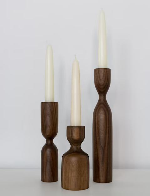 • Un ensemble de 3 bougeoirs en bois de noyer tournés à la main, (3 bougies incluses)
